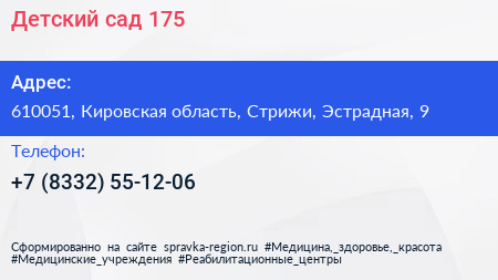 Детский сад №175 по адресу 610051, Кировская область, Стрижи, Эстрадная, 9 в дальнейшем Организация, размещена в следующих категориях: