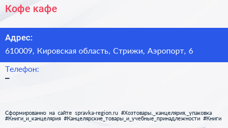Кофе, кафе по адресу 610009, Кировская область, Стрижи, Аэропорт, 6 в дальнейшем Организация, размещена в следующих категориях: