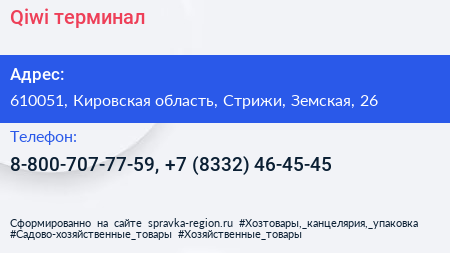 Qiwi, терминал по адресу 610051, Кировская область, Стрижи, Земская, 26 в дальнейшем Организация, размещена в следующих категориях: