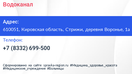 Водоканал по адресу 610051, Кировская область, Стрижи, деревня Воронье, 1а в дальнейшем Организация, размещена в следующих категориях: