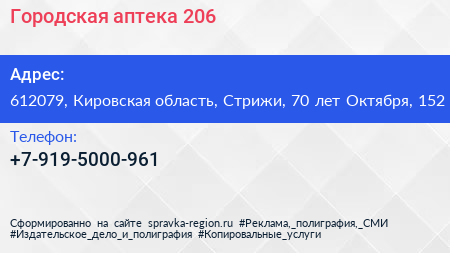 Городская аптека №206 по адресу 612079, Кировская область, Стрижи, 70 лет Октября, 152 в дальнейшем Организация, размещена в следующих категориях: