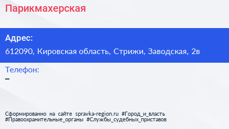 Парикмахерская по адресу 612090, Кировская область, Стрижи, Заводская, 2в в дальнейшем Организация, размещена в следующих категориях: