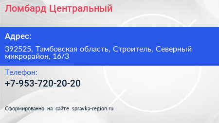 Ломбард Центральный по адресу 392525, Тамбовская область, Строитель, Северный микрорайон, 16/3 в дальнейшем Организация, размещена в следующих категориях: