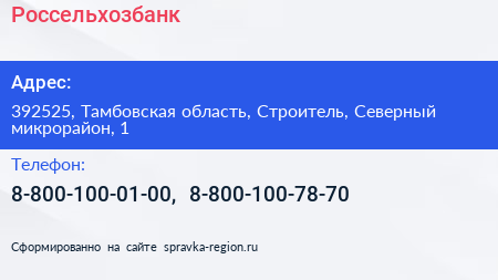 Россельхозбанк по адресу 392525, Тамбовская область, Строитель, Северный микрорайон, 1 в дальнейшем Организация, размещена в следующих категориях:
