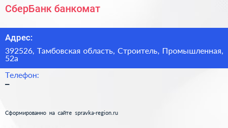 СберБанк, банкомат по адресу 392526, Тамбовская область, Строитель, Промышленная, 52а в дальнейшем Организация, размещена в следующих категориях: