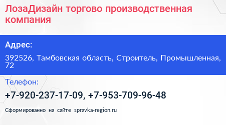ЛозаДизайн, торгово-производственная компания по адресу 392526, Тамбовская область, Строитель, Промышленная, 72 в дальнейшем Организация, размещена в следующих категориях: