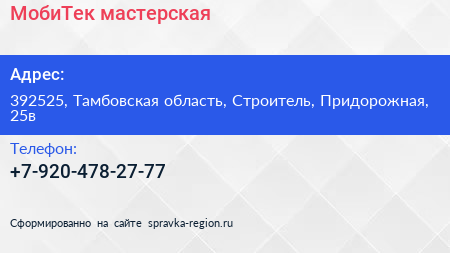 МобиТек, мастерская по адресу 392525, Тамбовская область, Строитель, Придорожная, 25в в дальнейшем Организация, размещена в следующих категориях: