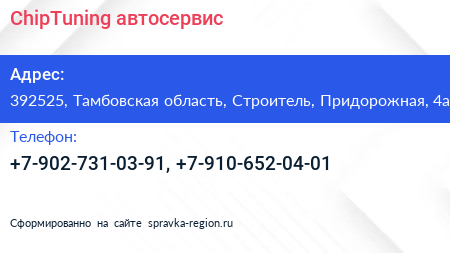 ChipTuning, автосервис по адресу 392525, Тамбовская область, Строитель, Придорожная, 4а в дальнейшем Организация, размещена в следующих категориях:
