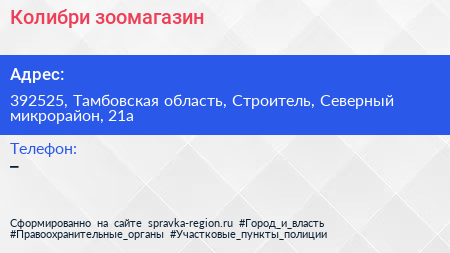 Колибри, зоомагазин по адресу 392525, Тамбовская область, Строитель, Северный микрорайон, 21а в дальнейшем Организация, размещена в следующих категориях: