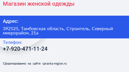 Магазин женской одежды по адресу 392525, Тамбовская область, Строитель, Северный микрорайон, 21а в дальнейшем Организация, размещена в следующих категориях: