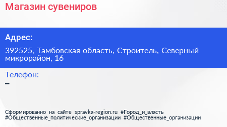 Магазин сувениров по адресу 392525, Тамбовская область, Строитель, Северный микрорайон, 16 в дальнейшем Организация, размещена в следующих категориях: