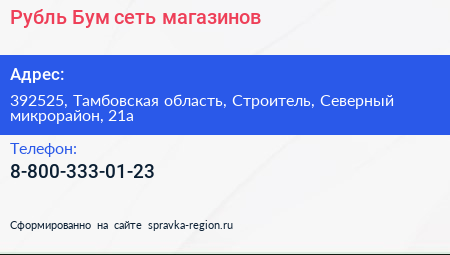 Рубль Бум, сеть магазинов по адресу 392525, Тамбовская область, Строитель, Северный микрорайон, 21а в дальнейшем Организация, размещена в следующих категориях: