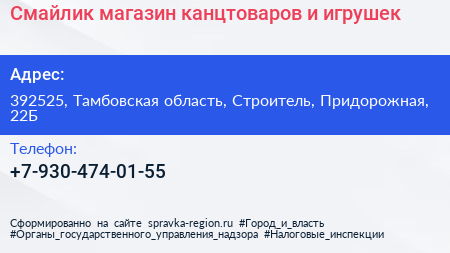 Смайлик, магазин канцтоваров и игрушек по адресу 392525, Тамбовская область, Строитель, Придорожная, 22Б в дальнейшем Организация, размещена в следующих категориях:
