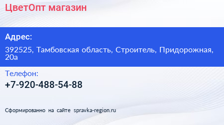 ЦветОпт, магазин по адресу 392525, Тамбовская область, Строитель, Придорожная, 20а в дальнейшем Организация, размещена в следующих категориях:
