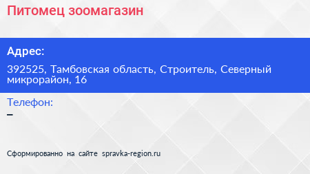 Питомец, зоомагазин по адресу 392525, Тамбовская область, Строитель, Северный микрорайон, 16 в дальнейшем Организация, размещена в следующих категориях: