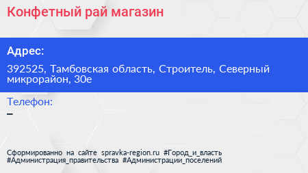 Конфетный рай, магазин по адресу 392525, Тамбовская область, Строитель, Северный микрорайон, 30е в дальнейшем Организация, размещена в следующих категориях: