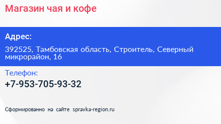 Магазин чая и кофе по адресу 392525, Тамбовская область, Строитель, Северный микрорайон, 16 в дальнейшем Организация, размещена в следующих категориях:
