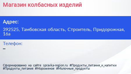 Магазин колбасных изделий по адресу 392525, Тамбовская область, Строитель, Придорожная, 16а в дальнейшем Организация, размещена в следующих категориях: