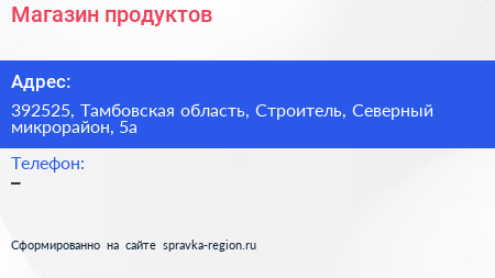 Магазин продуктов по адресу 392525, Тамбовская область, Строитель, Северный микрорайон, 5а в дальнейшем Организация, размещена в следующих категориях: