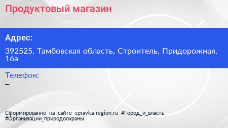 Продуктовый магазин по адресу 392525, Тамбовская область, Строитель, Придорожная, 16а в дальнейшем Организация, размещена в следующих категориях: