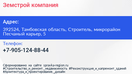 Земстрой, компания по адресу 392524, Тамбовская область, Строитель, микрорайон Песчаный карьер, 5 в дальнейшем Организация, размещена в следующих категориях: