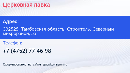 Церковная лавка по адресу 392525, Тамбовская область, Строитель, Северный микрорайон, 5а в дальнейшем Организация, размещена в следующих категориях: