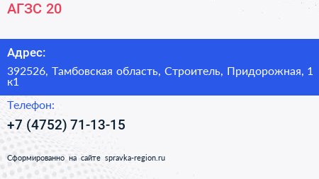 АГЗС№20 по адресу 392526, Тамбовская область, Строитель, Придорожная, 1 к1 в дальнейшем Организация, размещена в следующих категориях: