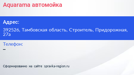 Aquarama, автомойка по адресу 392526, Тамбовская область, Строитель, Придорожная, 27а в дальнейшем Организация, размещена в следующих категориях: