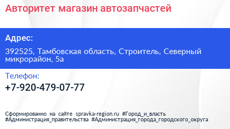 Авторитет, магазин автозапчастей по адресу 392525, Тамбовская область, Строитель, Северный микрорайон, 5а в дальнейшем Организация, размещена в следующих категориях: