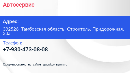 Автосервис по адресу 392526, Тамбовская область, Строитель, Придорожная, 33а в дальнейшем Организация, размещена в следующих категориях: