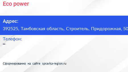 Eco power по адресу 392525, Тамбовская область, Строитель, Придорожная, 50 в дальнейшем Организация, размещена в следующих категориях: