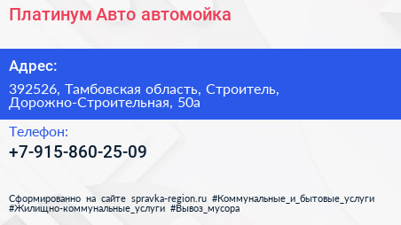 Платинум Авто, автомойка по адресу 392526, Тамбовская область, Строитель, Дорожно-Строительная, 50а в дальнейшем Организация, размещена в следующих категориях: