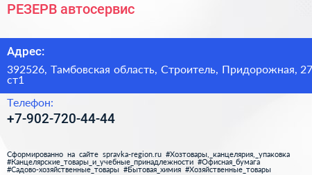РЕЗЕРВ, автосервис по адресу 392526, Тамбовская область, Строитель, Придорожная, 27 ст1 в дальнейшем Организация, размещена в следующих категориях:
