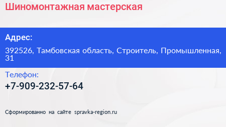 Шиномонтажная мастерская по адресу 392526, Тамбовская область, Строитель, Промышленная, 31 в дальнейшем Организация, размещена в следующих категориях: