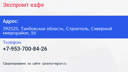Экспромт, кафе по адресу 392525, Тамбовская область, Строитель, Северный микрорайон, 16 в дальнейшем Организация, размещена в следующих категориях: