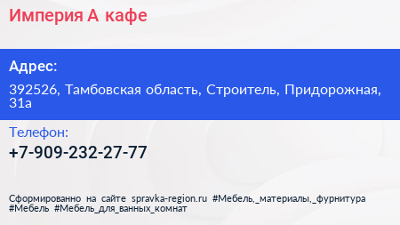 Империя А, кафе по адресу 392526, Тамбовская область, Строитель, Придорожная, 31а в дальнейшем Организация, размещена в следующих категориях: