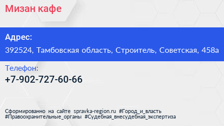 Мизан, кафе по адресу 392524, Тамбовская область, Строитель, Советская, 458а в дальнейшем Организация, размещена в следующих категориях: