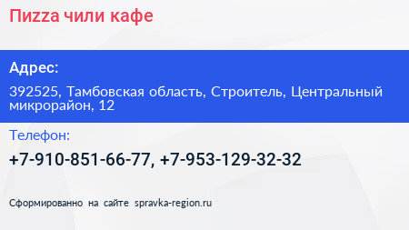 Пиzza-чили, кафе по адресу 392525, Тамбовская область, Строитель, Центральный микрорайон, 12 в дальнейшем Организация, размещена в следующих категориях: