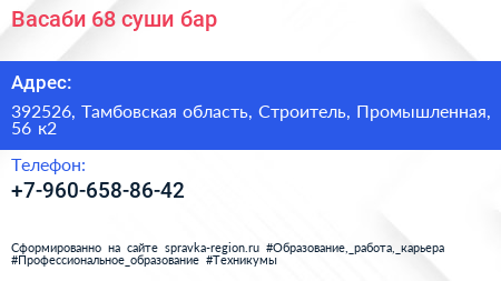 Васаби 68, суши-бар по адресу 392526, Тамбовская область, Строитель, Промышленная, 56 к2 в дальнейшем Организация, размещена в следующих категориях: