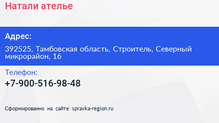 Натали, ателье по адресу 392525, Тамбовская область, Строитель, Северный микрорайон, 16 в дальнейшем Организация, размещена в следующих категориях:
