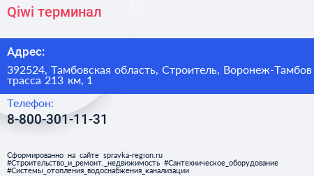 Qiwi, терминал по адресу 392524, Тамбовская область, Строитель, Воронеж-Тамбов трасса 213 км, 1 в дальнейшем Организация, размещена в следующих категориях: