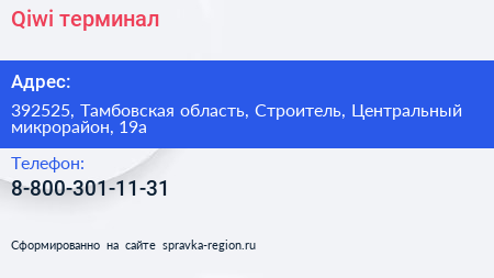 Qiwi, терминал по адресу 392525, Тамбовская область, Строитель, Центральный микрорайон, 19а в дальнейшем Организация, размещена в следующих категориях: