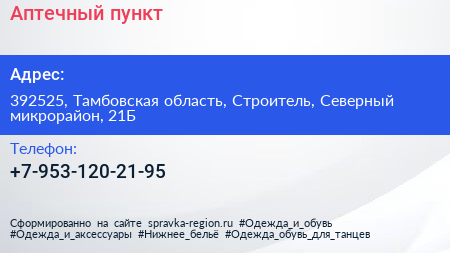 Аптечный пункт по адресу 392525, Тамбовская область, Строитель, Северный микрорайон, 21Б в дальнейшем Организация, размещена в следующих категориях: