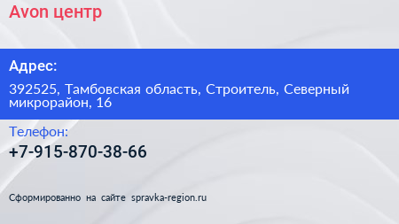 Avon, центр по адресу 392525, Тамбовская область, Строитель, Северный микрорайон, 16 в дальнейшем Организация, размещена в следующих категориях: