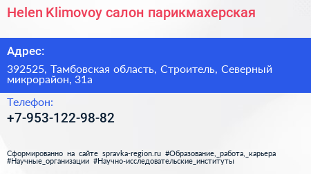 Helen Klimovoy, салон-парикмахерская по адресу 392525, Тамбовская область, Строитель, Северный микрорайон, 31а в дальнейшем Организация, размещена в следующих категориях:
