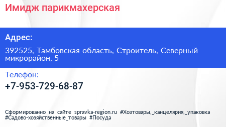 Имидж, парикмахерская по адресу 392525, Тамбовская область, Строитель, Северный микрорайон, 5 в дальнейшем Организация, размещена в следующих категориях: