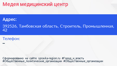 Медея, медицинский центр по адресу 392526, Тамбовская область, Строитель, Промышленная, 42 в дальнейшем Организация, размещена в следующих категориях: