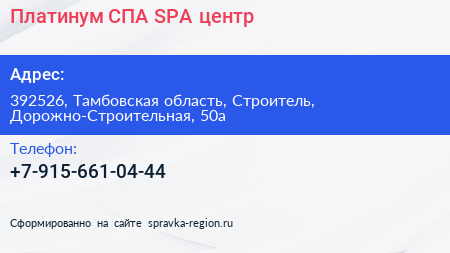 Платинум СПА, SPA-центр по адресу 392526, Тамбовская область, Строитель, Дорожно-Строительная, 50а в дальнейшем Организация, размещена в следующих категориях: