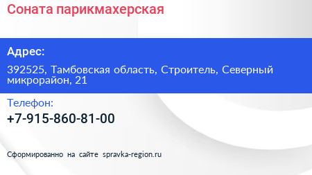 Соната, парикмахерская по адресу 392525, Тамбовская область, Строитель, Северный микрорайон, 21 в дальнейшем Организация, размещена в следующих категориях: