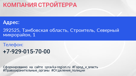 КОМПАНИЯ СТРОЙТЕРРА по адресу 392525, Тамбовская область, Строитель, Северный микрорайон, 1 в дальнейшем Организация, размещена в следующих категориях: